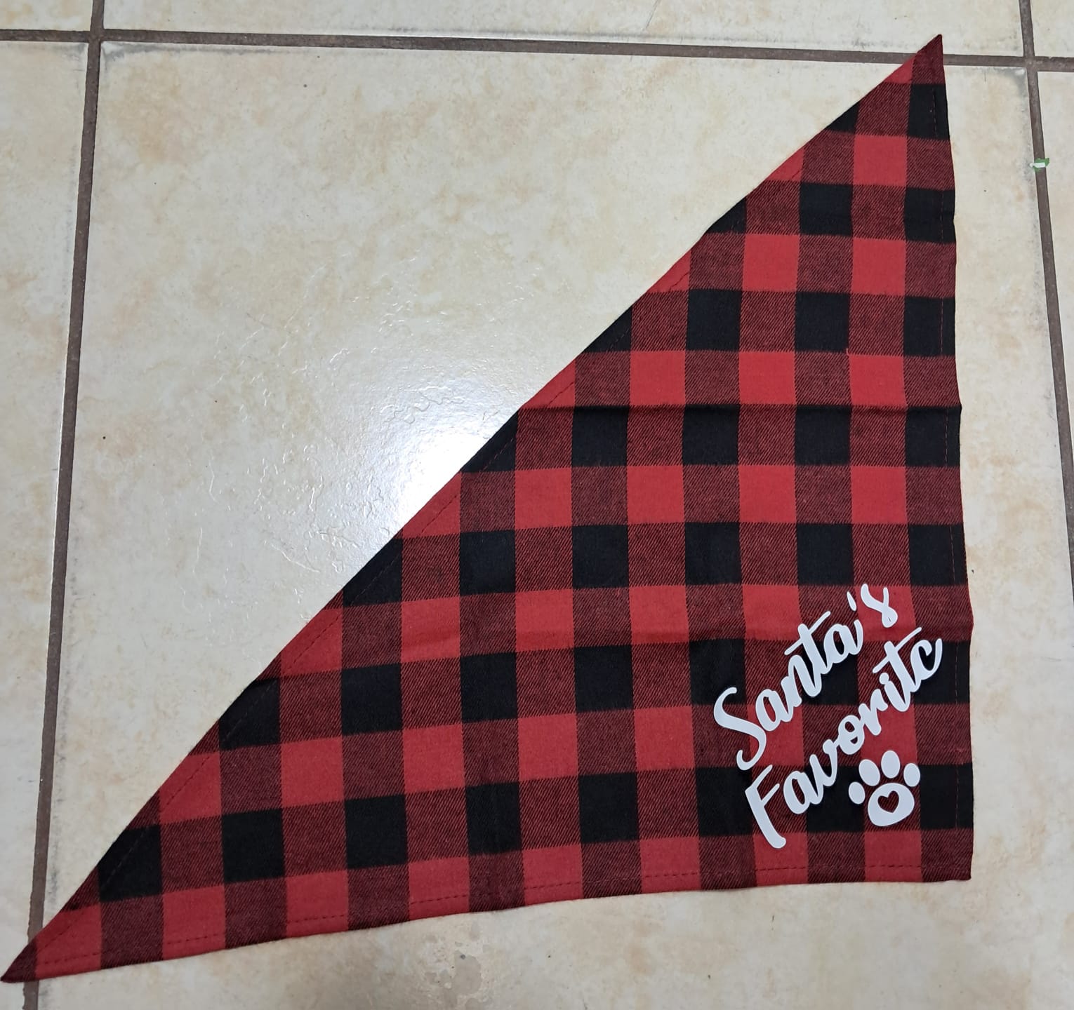 🐾 BANDANA NAVIDEÑA “SANTA’S FAVORITE” – CUADROS ROJO Y NEGRO
