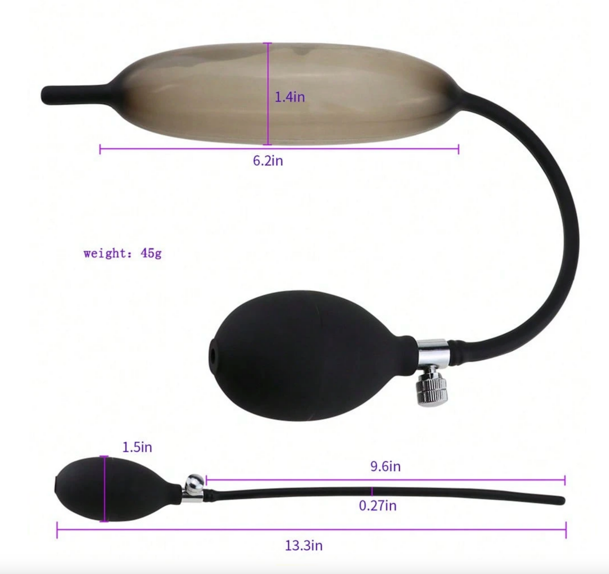 Infla-me el Pecado es la herramienta perfecta para quienes disfrutan del juego anal con niveles de intensidad que se pueden ajustar a su antojo. Este inflador anal está hecho de silicona suave y resistente, con una bombilla manual que permite expandir suavemente el globo insertable dentro del ano, aumentando el volumen y la presión para un placer tan intenso como controlado. Cuenta con válvula metálica de liberación rápida para máxima seguridad, ideal para quienes practican el BDSM, el entrenamiento anal o simplemente quieren jugar con sensaciones nuevas. Se recomienda usar con lubricante base agua, insertar desinflado y comenzar a inflar poco a poco mientras explorás tus límites. ¡Tu trasero, tus reglas!