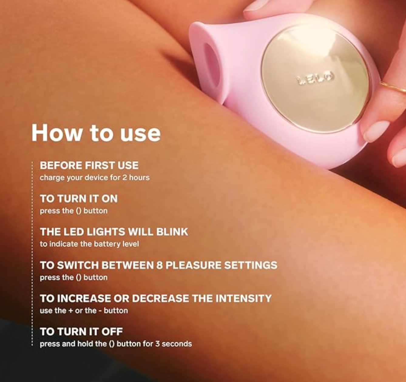 Antes del primer uso, cargá el dispositivo durante 2 horas. Para encenderlo, presioná el botón central (⭘). Las luces LED parpadearán indicando el nivel de batería. Cambiá entre los 8 modos de placer con el mismo botón. Ajustá la intensidad con los botones “+” o “–”. Para apagarlo, mantené presionado el botón (⭘) por 3 segundos.